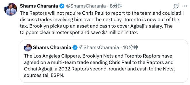 猛龙队不会要求保罗向球队报到,并且可能在未来一天内继续讨论涉及他的交易。随后名记Hayes报道称,猛龙预计会裁掉保罗。