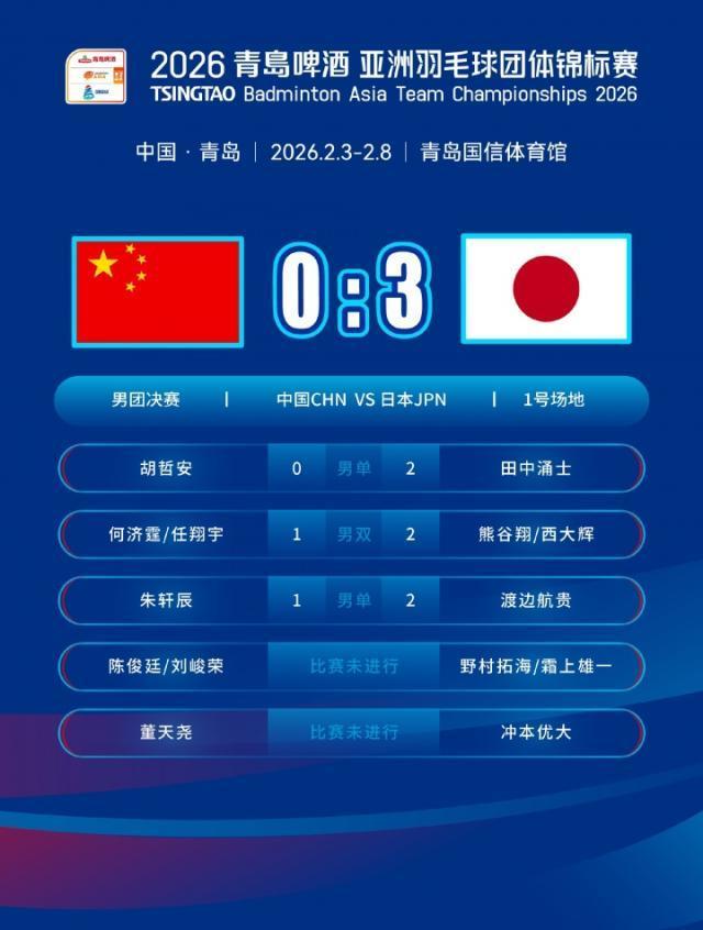 亚洲羽毛球团体锦标赛男团决赛,国羽总比分0比3负于日本队,无缘卫冕赛事冠军。这是日本队首次夺得亚团赛男团冠军。日本男团也自12年前汤杯以来,首次击败中国队。对阵赛果如下: